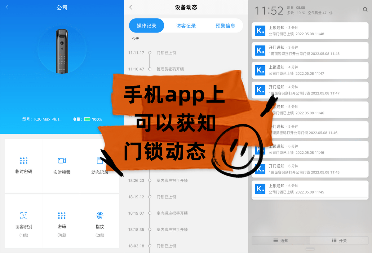 最后是安全方面的方便:门锁,又是一个电子猫眼。随时可以通过手机查看门外的情况,当门外有人徘徊时,我们的手机还会收到一小段视频。