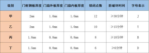 国标中将防盗门划分为甲乙丙丁四个等级,想要辨别自家防盗门属于哪个等级,方式很简单,直接看门框或门板上的钢印,印的是丁就是丁级。四个等级有什么区别呢?看看下面这张图就知道了。